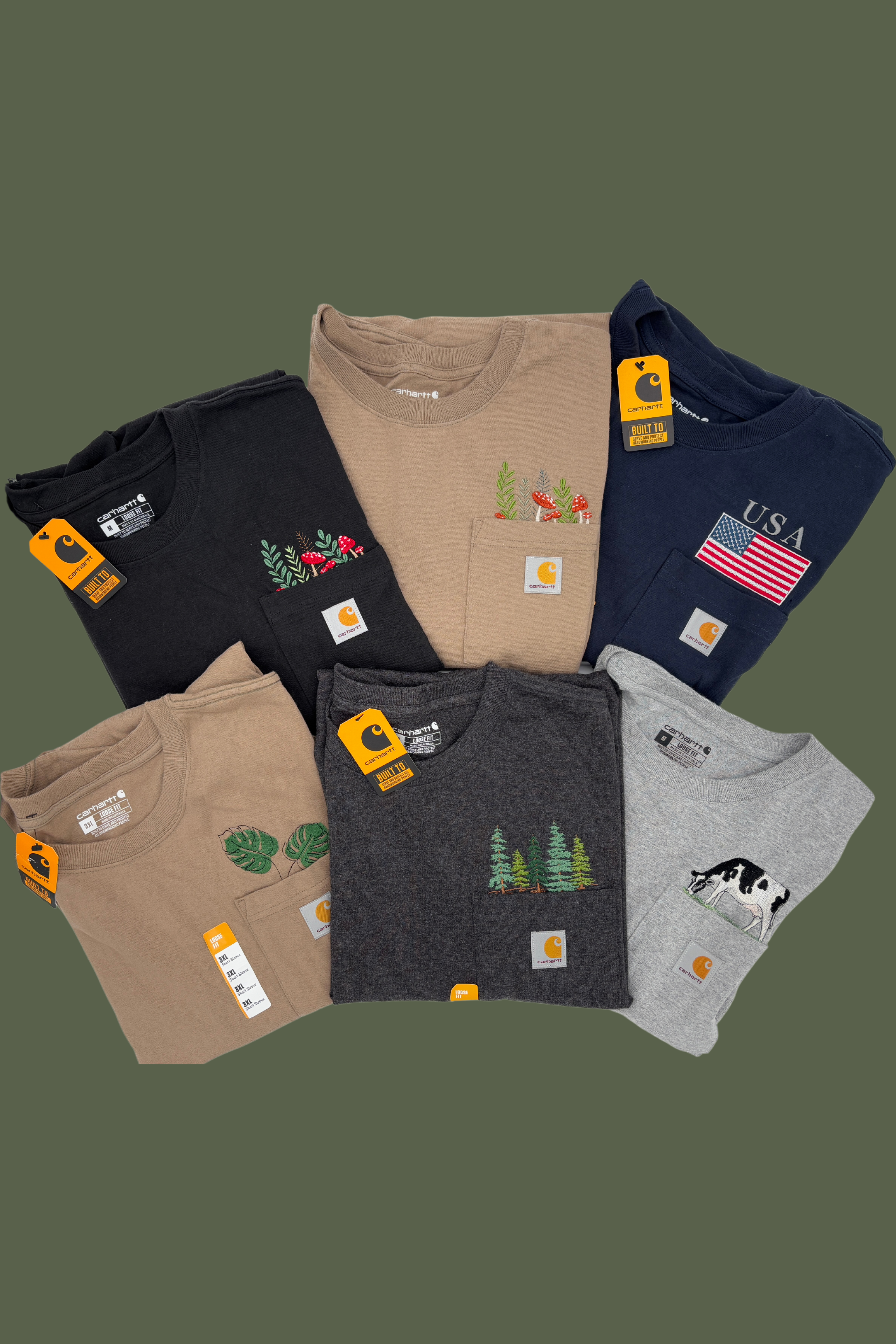 Shop our collection of custom embroidered Carhartt shirts! These are authentic Carhartt tees embroidered in house for a one-of-a-kind look.