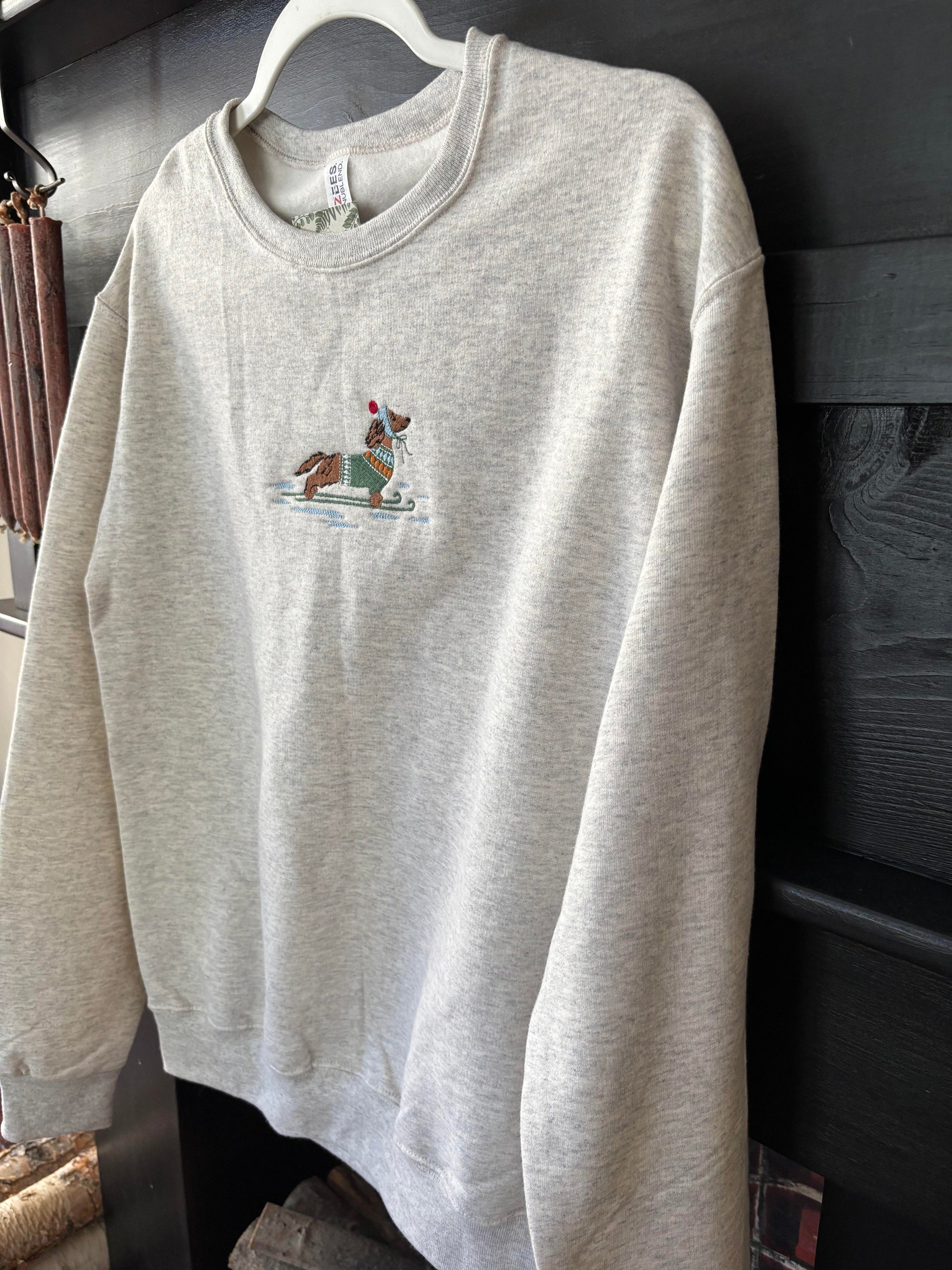 - This sweatshirt features quality embroidery, making it perfect for festive occasions. The design includes a charming dachshund through the snow, adding a festive touch.